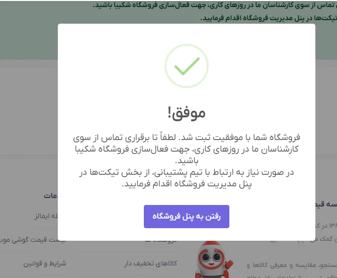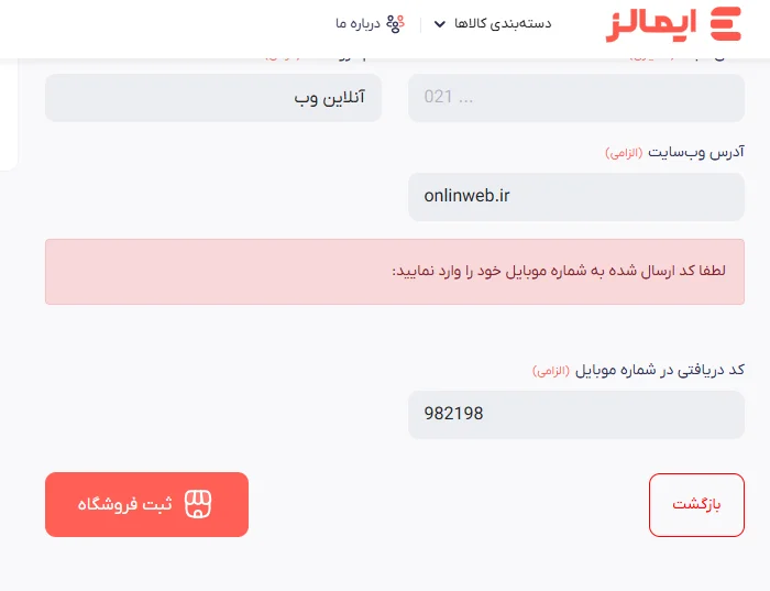 پس از تکمیل اطلاعات مربوط به فروشگاه خودتون کد تایید پیامک شده به شماره همراه خود را وارد و سپس روی گزینه ثبت فروشگاه کلیک کنید.
