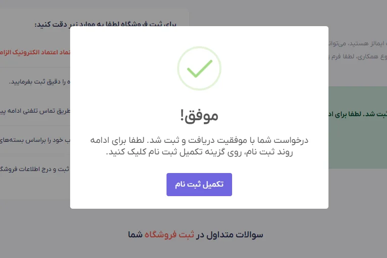 پس از تایید شماره موبایل خود، روی گزینه تکمیل ثبت نام کلیک کرده و اطلاعات دقیق و تکمیلی کسب و کار آنلاین خود را وارد کرده و تایید نمایید. حتما توجه فرمایید که موارد خواسته شده را درست و دقیق وارد کرده تا در مراحل بعدی با مشکل مواجه نشوید.