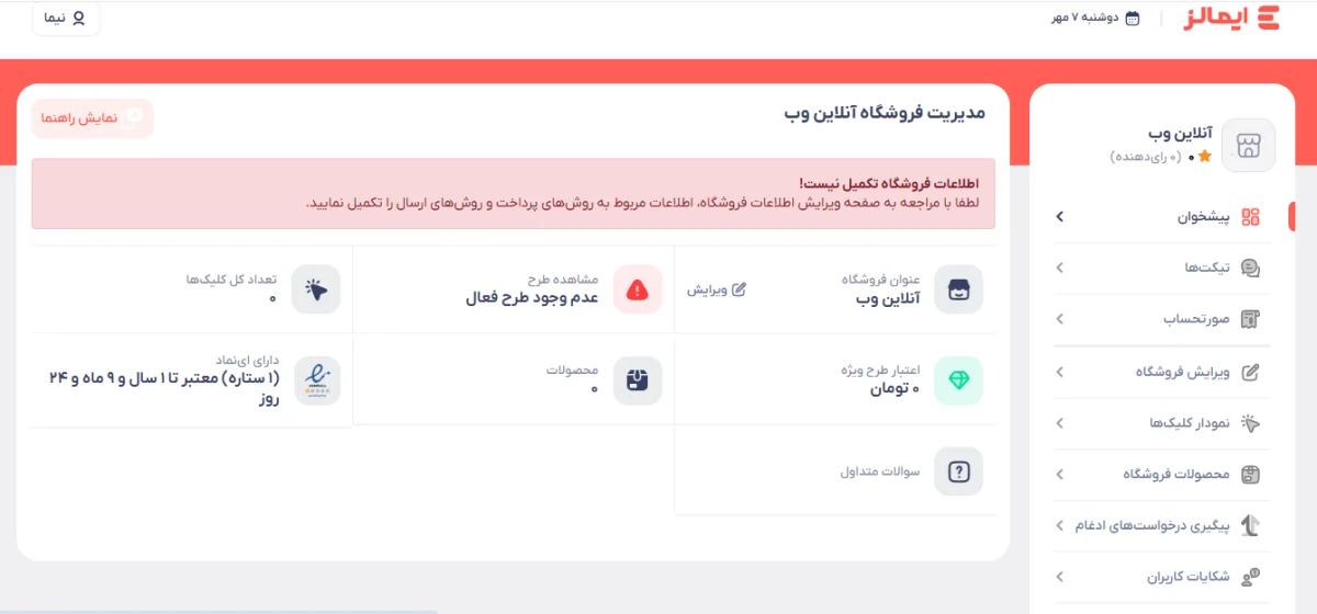 وارد سایت ایمالز شده و از طریق قسمت (ثبت نام فروشندگان) وارد سایت ایمالز شوید؛ سپس روی گزینه فرروشگاه آنلاین کلیک کنید.